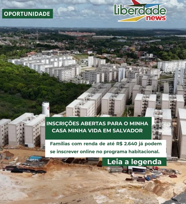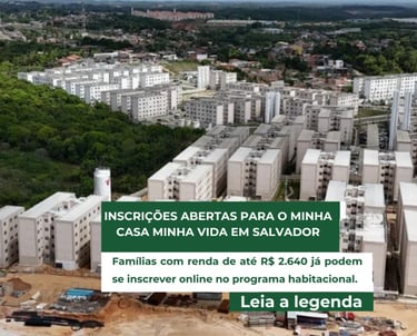 A Prefeitura de Salvador abriu as inscrições para o programa Minha Casa, Minha Vida, voltado para famílias com *renda mensal de até R\$ 2.640*. O cadastro é gratuito, feito exclusivamente pela internet, e não há previsão de encerramento imediato.Podem se inscrever pessoas que não tenham imóvel próprio e que nunca tenham sido beneficiadas por outros programas habitacionais. O objetivo é ampliar o acesso à moradia popular para grupos em situação de vulnerabilidade, especialmente nas áreas urbanas de Salvador.